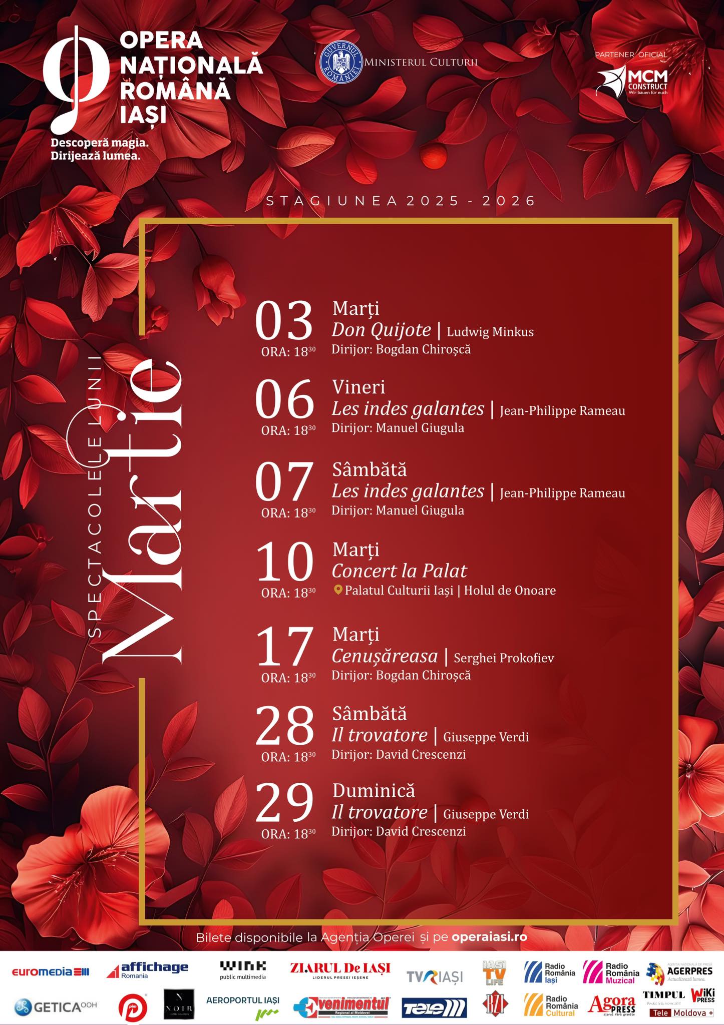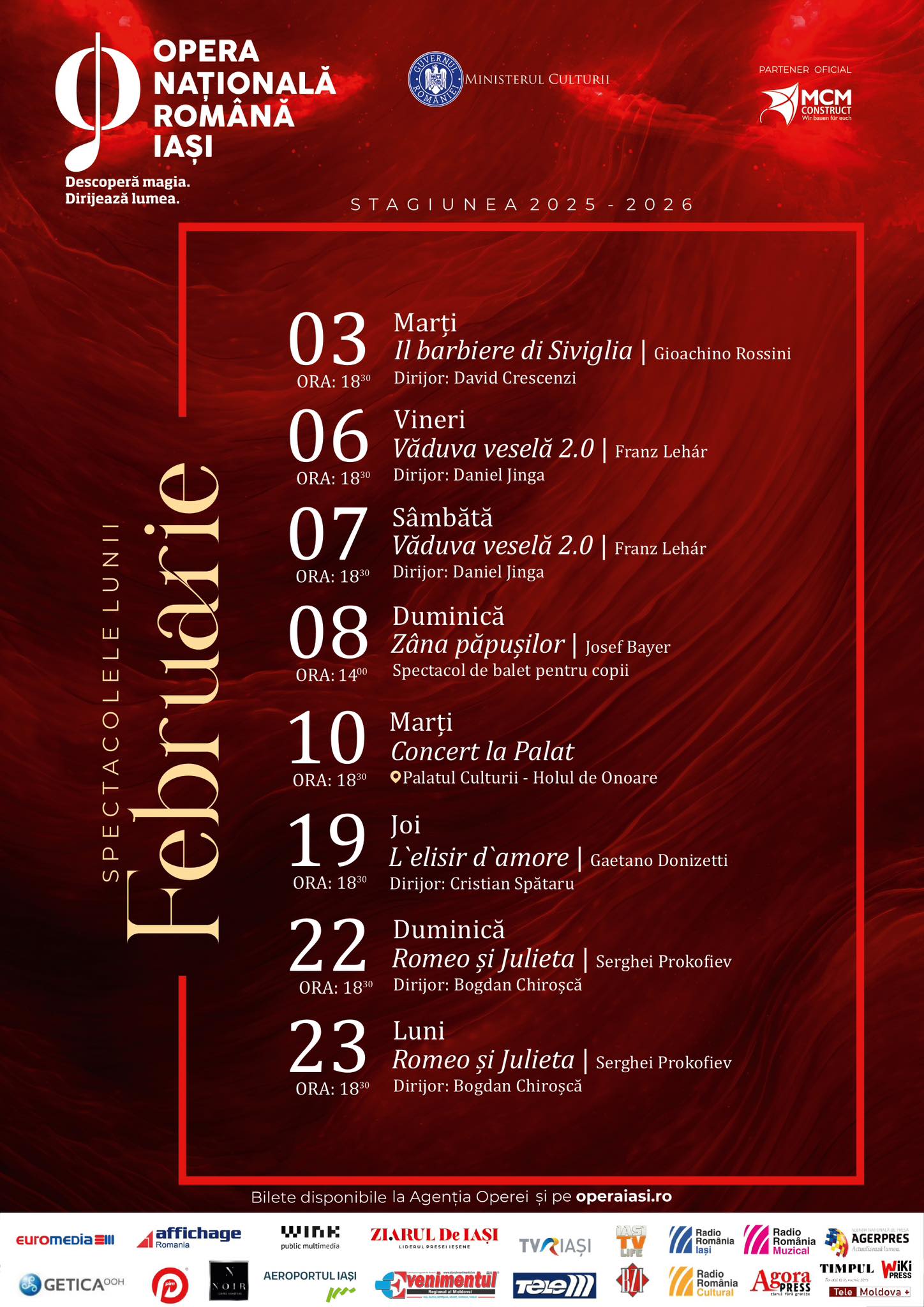 De la verva inconfundabilă din Il barbiere di Siviglia, la farmecul irezistibil al operetei Văduva veselă, de la magia copilăriei din Zâna păpușilor, la întâlnirea specială de la Palat, și până la emoția pură din L’elisir d’amore și dramatismul baletului Romeo și Julieta, fiecare seară promite o experiență memorabilă.