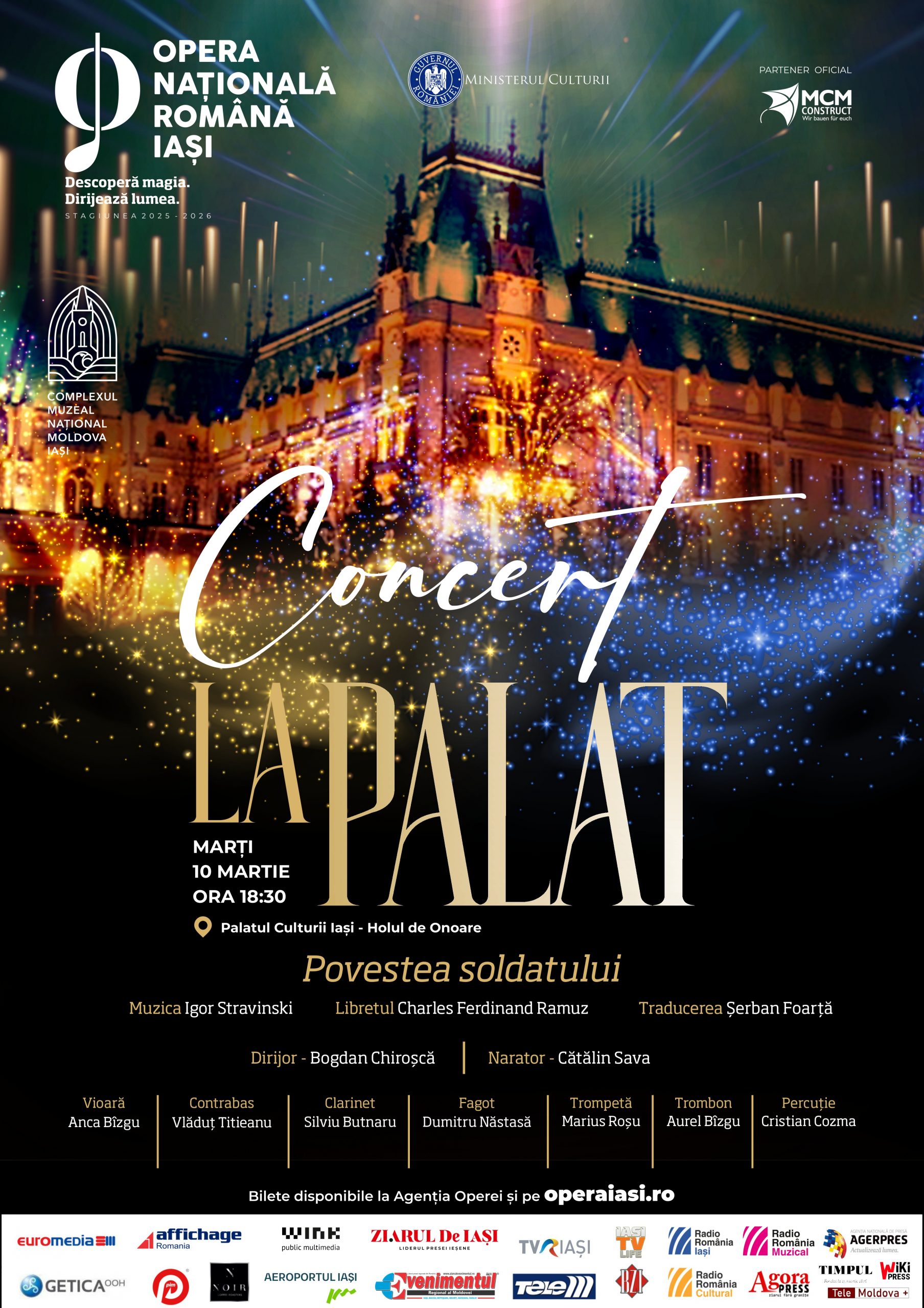 Pe 10 martie, de la ora 18:30, în Holul de Onoare al Palatului Culturii, un septet cameral format din artiști instrumentiști ai Operei Naționale Române din Iași vă invită la o experiență muzicală aparte: „Povestea soldatului” de Igor Stravinski, una dintre cele mai originale lucrări de teatru muzical ale secolului XX.
