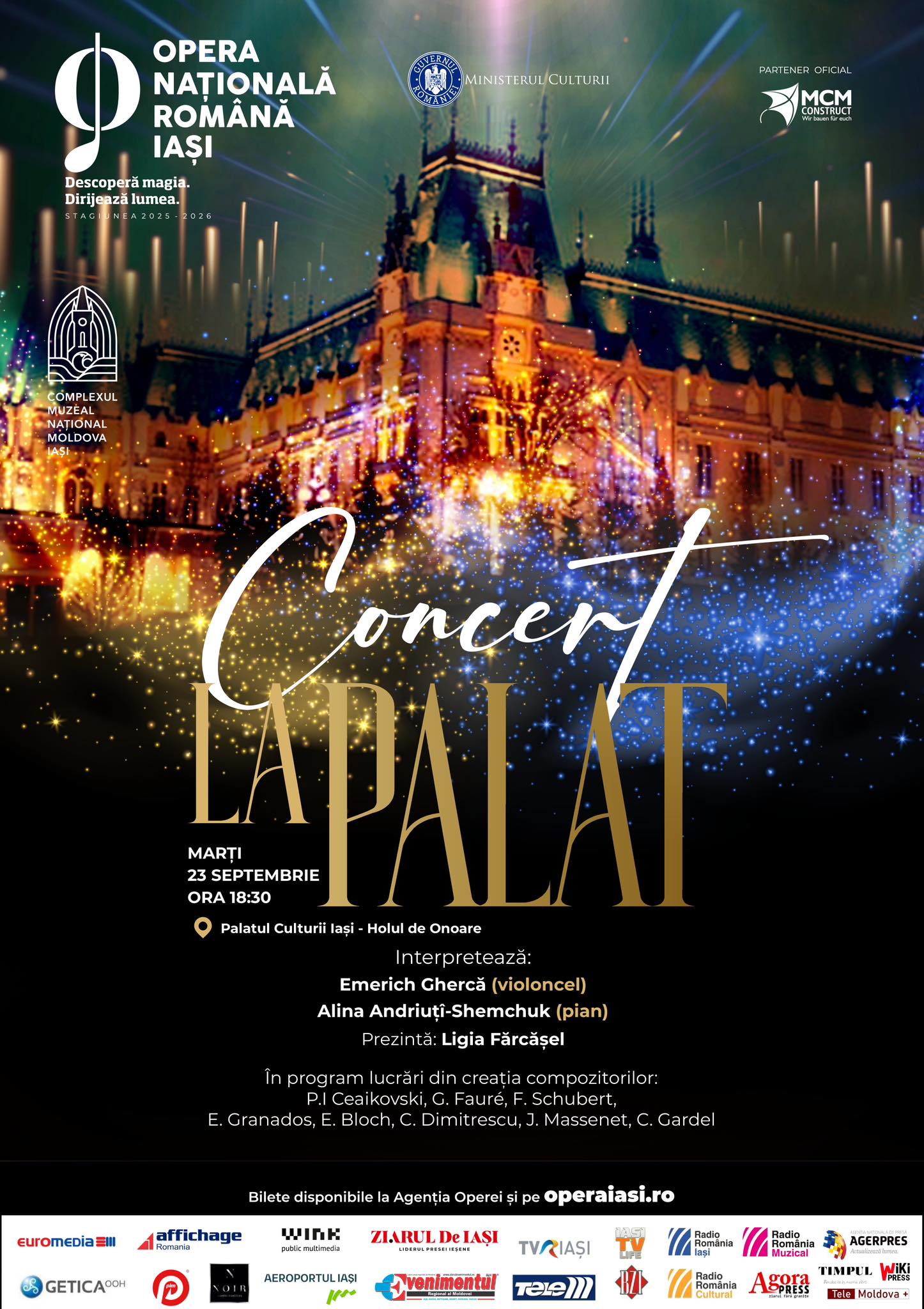 Marți, 23 septembrie, de la ora 18:30, vă invităm la Concert la Palat, o seară în care violoncelul și pianul vor țese povești sonore într-un cadru de vis.
