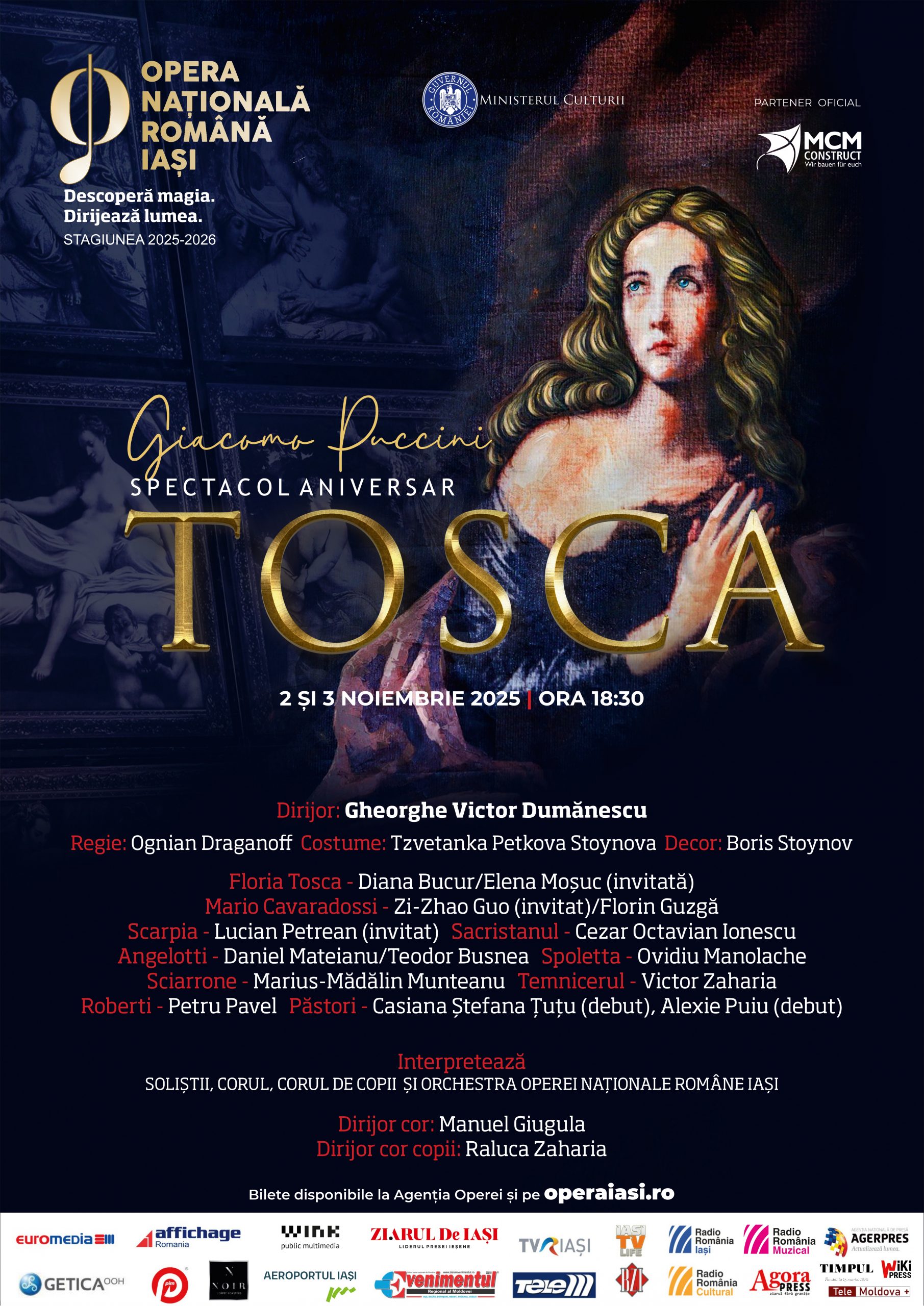 Marcăm întâlnirea unică dintre muzică, pasiune și destin cu două reprezentații ale uneia dintre cele mai dramatice și intense creații ale lui Giacomo Puccini, TOSCA, care vor avea loc pe 2 și 3 noiembrie, de la ora 18:30.