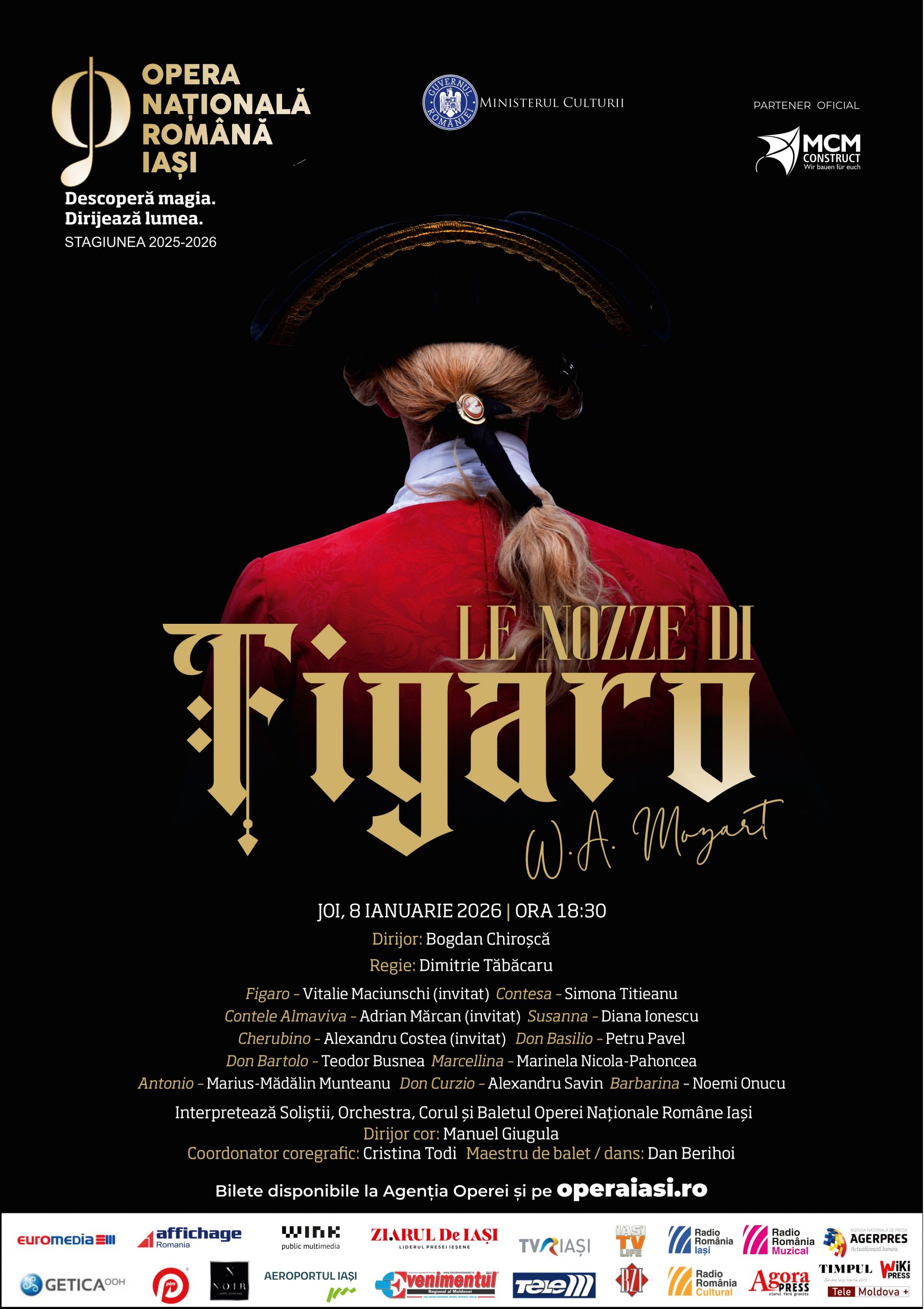 Le nozze di Figaro de Wolfgang Amadeus Mozart – intrigi savuroase, iubire, gelozie și o muzică ce pulsează de viață – capodopera mozartiană revine pe 8 ianuarie, de la 18:30, într-o seară plină de energie și rafinament, susținută de o distribuție remarcabilă.