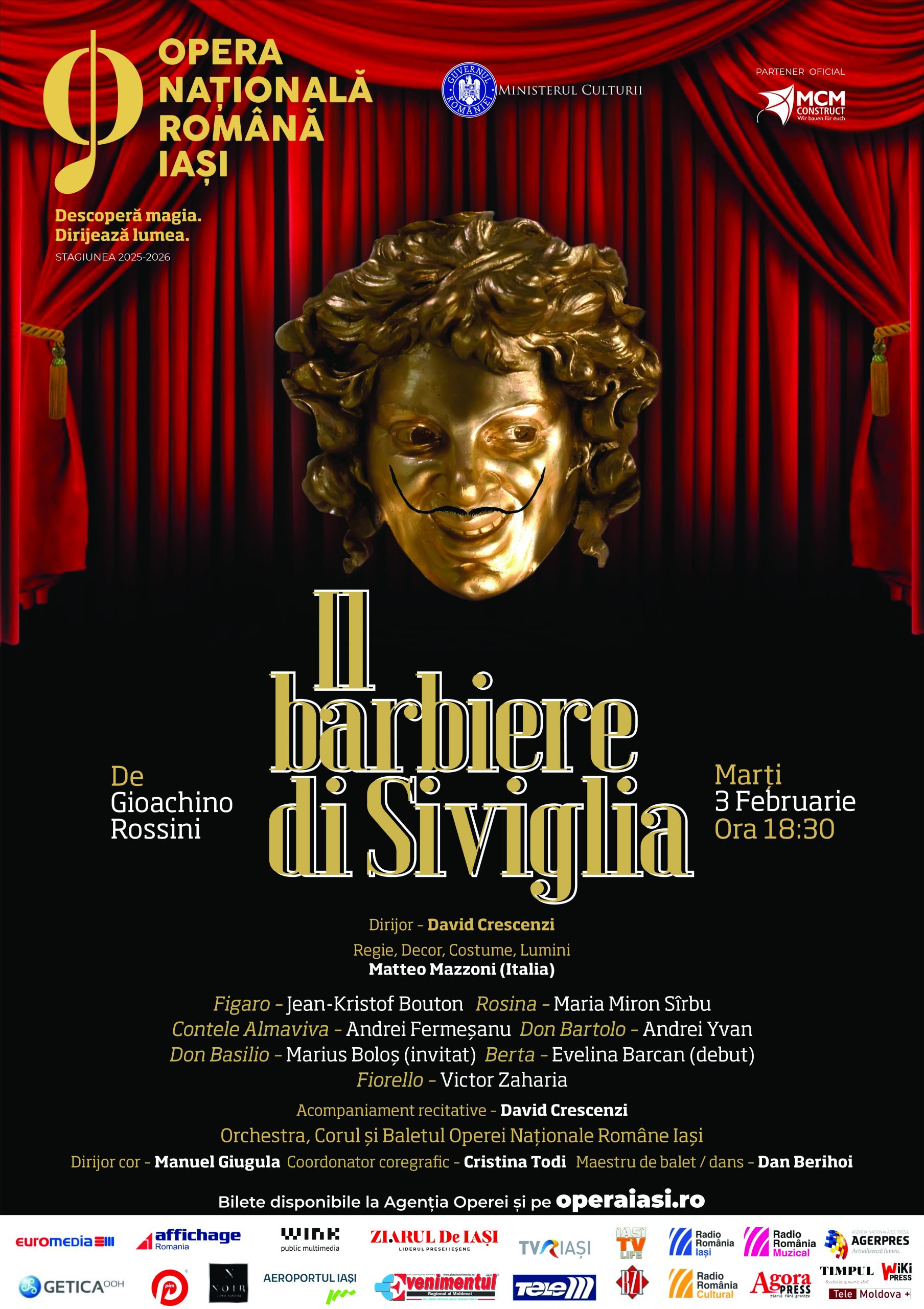 În rolurile principale îi veți putea urmări pe îndrăgitul bariton de origine canadiană Jean-Kristoff Bouton în rolul lui Figaro, pe mezzosoprana Maria Miron-Sîrbu în rolul isteței Rosina și pe tenorul Andrei Fermeșanu, care va da viață fermecătorului Conte Almaviva.